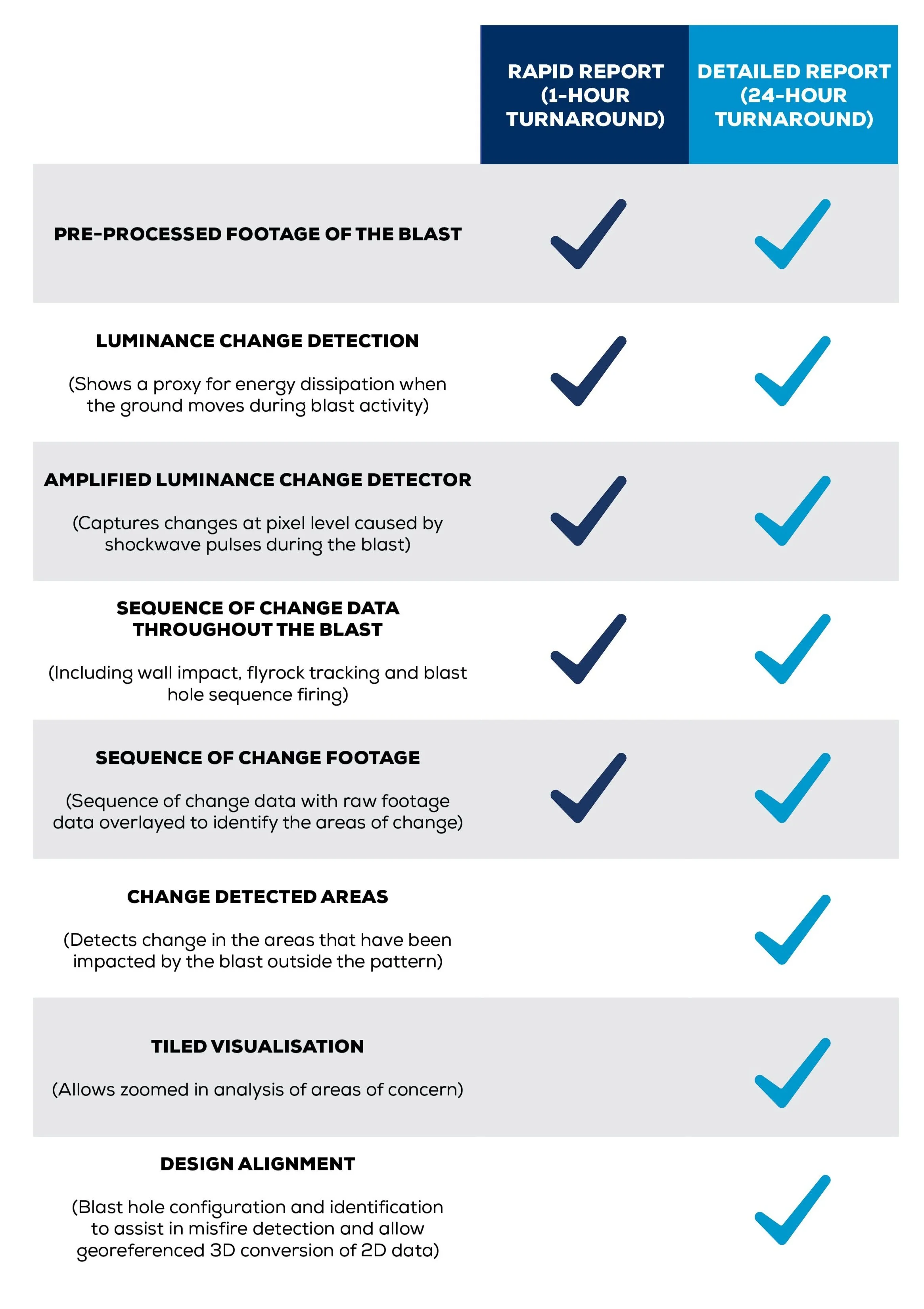 When it comes to reviewing the blast data and conducting detailed analysis, BlastVision® offers two options; the Rapid report subscription, or the Detailed Analysis subscription.